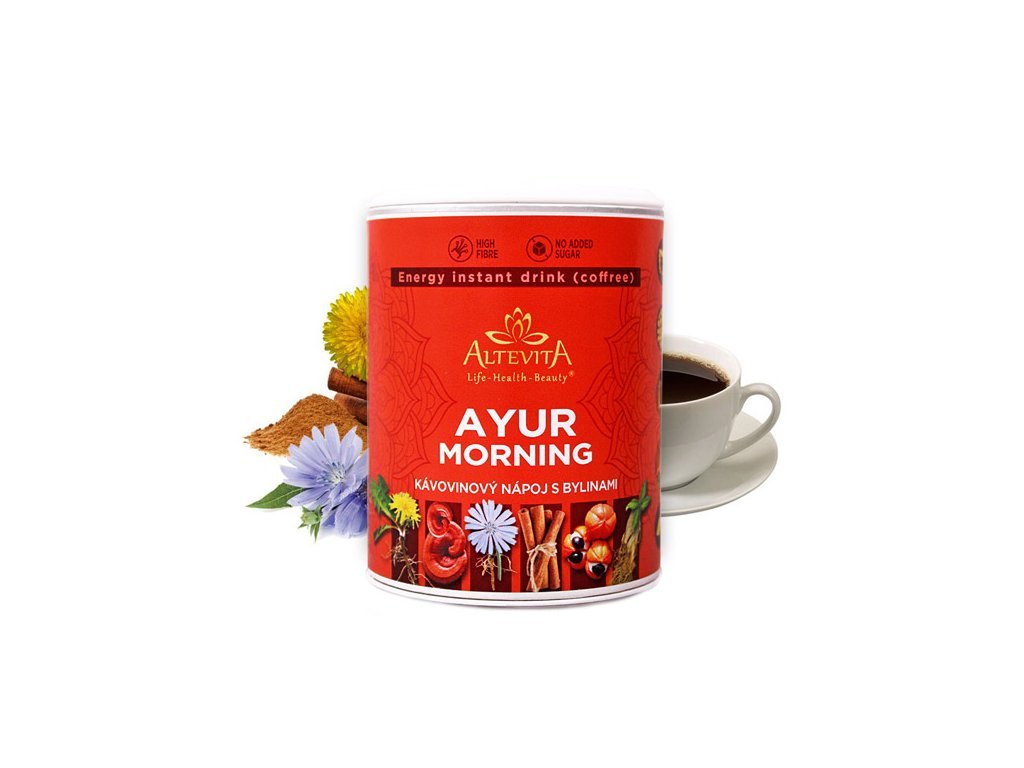 Altevita Ayur Morning je kávovinový nápoj inšpirovaný ajurvédou, určený pre prirodzený ranný štart bez kofeínu. Vychádza zo základu praženého koreňa čakanky, ktorý dodáva nápoju jemnú kávovú chuť a zároveň podporuje trávenie vďaka obsahu inulínu – prebiotickej vlákniny.