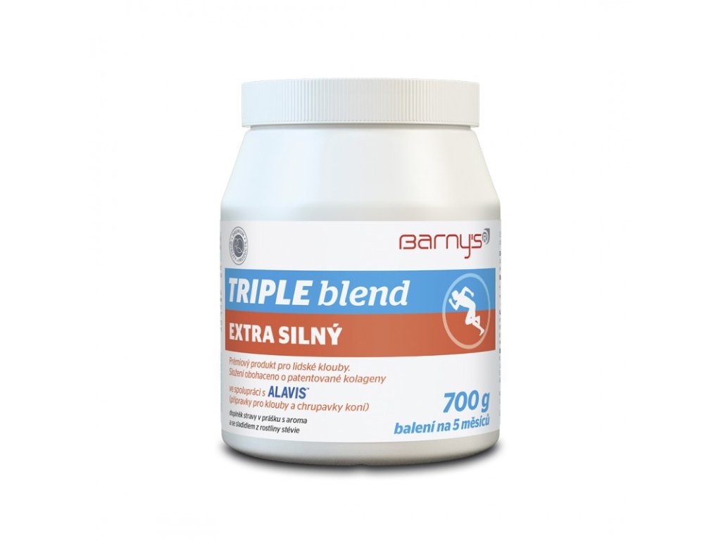 Barny's TRIPLE blend extra silný je jedným z najúčinnejsćh produktov na trhu na akútne, ale aj chronické problémy pohybového aparíátu. Obsahuje kombináciu chondroprotektívnych látok, ako sú glukózamín a chondroitín sulfát, látku MSM a kolagény z overeného prírodného zdroja. Chondroprotektívne látky spolu s kolagénom II. typu prirodzene tvoria štruktúru kĺbovej chrupavky, kým kolagén I. typu je súčasťou väziva a MSM (methylsulfonylmethan) je zdrojom organicky viazanej síry. Navyše je tento produkt obohatený o vitamín C, ktorý je dôležitý pre normálnu tvorbu kolagénu a prirodzenú funkciu chrupavky a kostí.