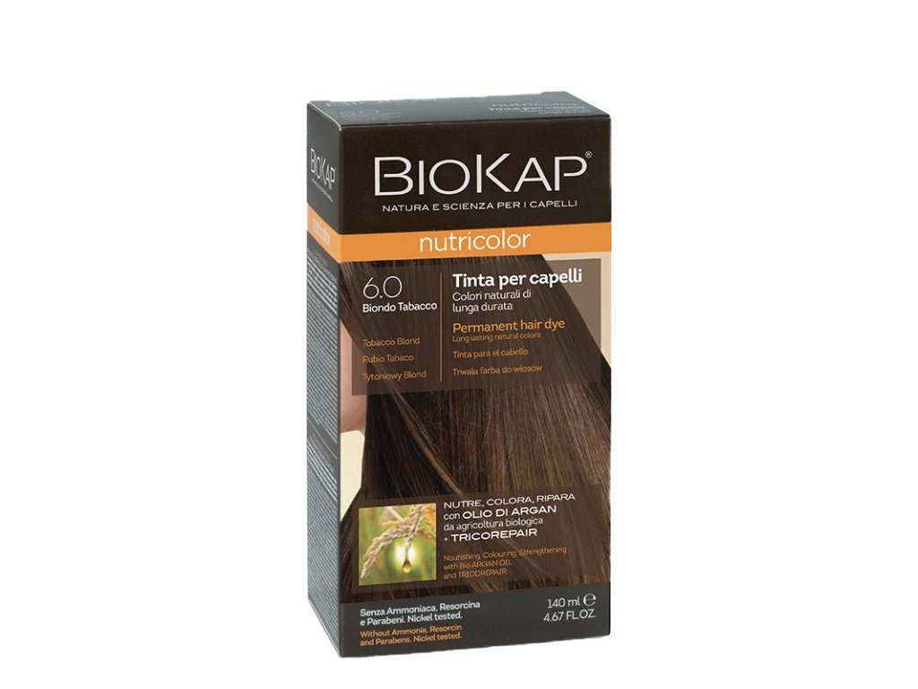 Exkluzívna receptúra farieb BioKap Nutricolor je výnimočná svojou vysokou znášanlivosťou pre pokožku, ktorá vyživuje a regeneruje vlasy pri farbení a dokonale kryje sivé vlasy. Odteraz sa už nemusíte obávať alergických reakcií pri farební vašich vlasov v pohodlí domova. Prírodné zloženie Talianskych farieb BioKap zaručí dokonalý výsledok bez použitia amoniaku a iných dráždivých látok. Jemné zloženie BioKap Nutricolor nedráždi pokožku hlavy a neoslabuje vlasy.