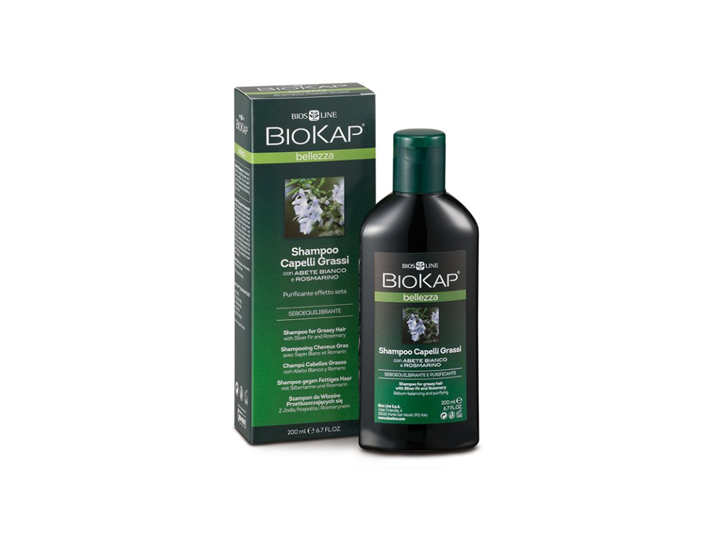 Šampón BioKap® pre mastné vlasy obsahuje extrakt z jedľe striebornej, ktorá pomáha znižovať tvorbu nadmerného mazu na pokožke hlavy; Ovocné kyseliny, ktoré majú exfoliačný a obnovujúci účinok; Výťažky z machu, rozmarínu a lopúcha, ktoré čistia pokožku; Mentol a organický éterický olej Melaleuca alternifolia, ktoré majú osviežujúci účinok. Receptúra je obohatená o organický gél z aloe vera, ktorý má ochranný účinok na pokožku hlavy.