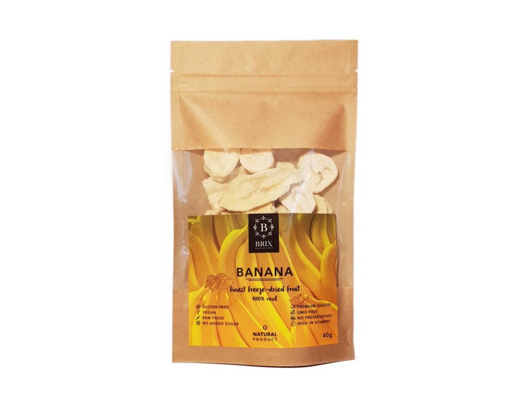 Mrazom sušený banán je RAW, bez pridania cukru, neobsahujú lepok ani konzervanty, vhodné pre vegánov, GMO FREE, s vysokým obsahom vit. C.