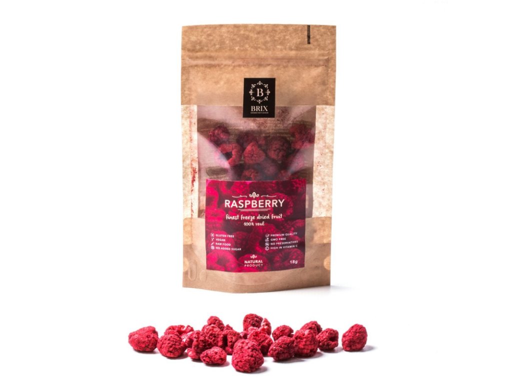 Zloženie: 100% maliny dehydrované procesom lyofilizácie (proces sušenia mrazom).