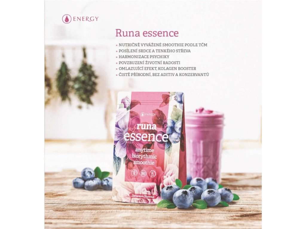 Runa essence je dokonale vyladené a nutrične vyvážené smoothie. Prírodné suroviny vysokej kvality v unikátnej kombinácii. Biorytmické smoothie podľa princípov tradičnej čínskej medicíny. Osviežuje, harmonizuje psychiku, posilňuje srdce s tenké črevo.