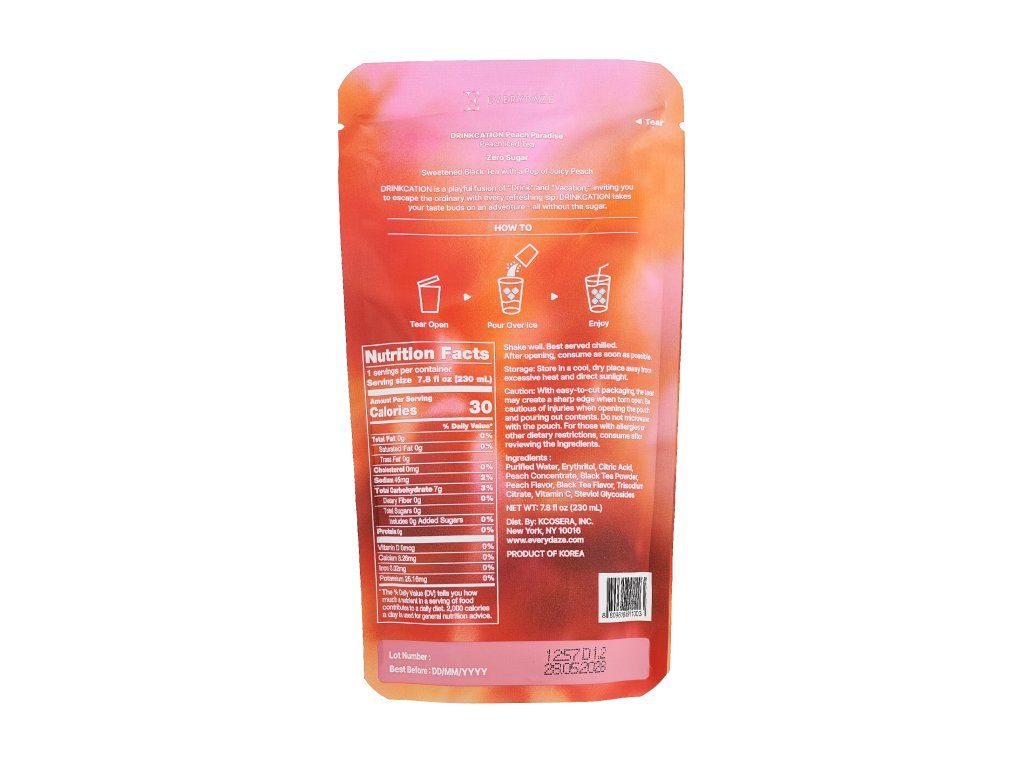 🌞🍑 Peach Paradise je osviežujúci broskyňový ľadový čaj, ktorý vás prenesie do tropického raja. Sladený čierny čaj s šťavnatou chuťou broskyne je ideálny pre chvíle relaxu. Stačí pretrepať, naliať do pohára a vychutnať si ho ľadovo studený. Perfektný ako občerstvenie na cesty alebo po tréningu, ale môžete ho prispôsobiť aj rôznymi mixmi na koktaily, smoothies alebo ako súčasť domácej kaviarne. Kamkoľvek idete, DRINKCATION vám prináša radosť z každého dúšku.