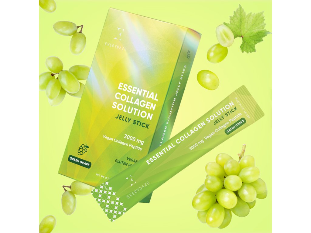 Essential Collagen Solution Jelly Stick s príchuťou zeleného hrozna je chutný a praktický spôsob, ako podporiť tvorbu kolagénu a prispieť k zlepšeniu zdravia pokožky, vlasov, nechtov a kĺbov. Každá želé tyčinka obsahuje až 3000 mg vegánskeho kolagénového peptidu, ktorý je extrahovaný z rastliny ibišteka pomocou patentovanej technológie. Táto pozoruhodná odroda ibišteka bola špeciálne vynájdená na dosiahnutie extrakcie najvyššieho obsahu kolagénu s ďalšími výhodami antioxidantov z fytochemikálií.