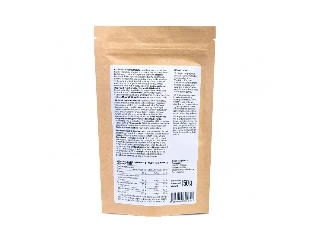 Zloženie: Kokosové mlieko v prášku (extrakt z dužiny kokosových orechov, maltodextrín), kokosový cukor, ovsený betaglukán 15%, ovsený instantný prášok, datľový prášok, premium matcha prášok 6%, prírodná vanilková aróma, Bacillus coa . na porciu).
