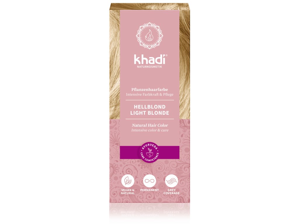Khadi blond farba rešpektuje prirodzenú štruktúru vlasov a nezasahuje do pigmentácie – výsledok je šetrný a prirodzený. Vhodná aj na šediny.