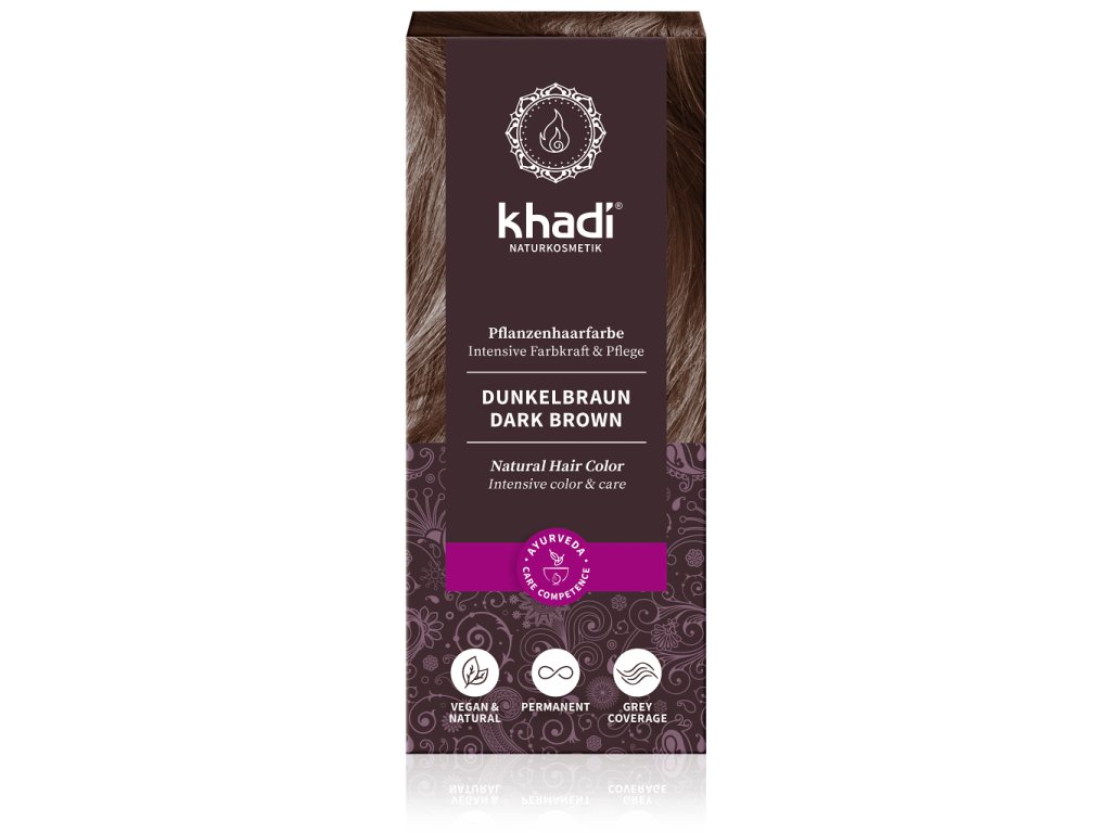 Rastlinná farba na vlasy Khadi TMAVO HNEDÁ farbí vlasy na tmavo hnedo. Výsledný farebný tón je závislý na prirodzenej farbe Vašich vlasov.