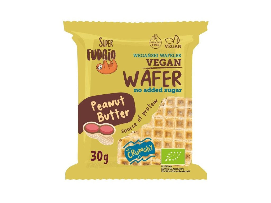 Samostatne balená oblátka Super Fudgio - vegánska oblátka plnená slaným arašidovým maslom bez pridaného cukru, snack vyrobený ako domáce vafle vrstvené krémom alebo džemom. Chuť - pre fanúšika slaného arašidového masla.