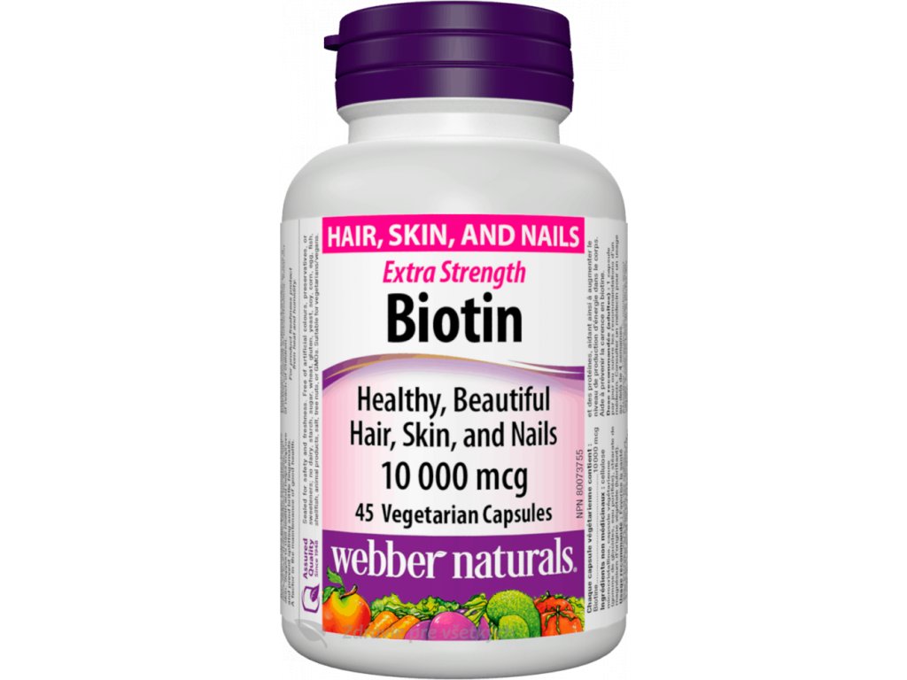 Biotín je esenciálny vitamín B potrebný pre metabolizmus sacharidov, tukov a bielkovín podporujúci optimálnu energetickú hladinu. Biotín je jedným z faktorov udržiavania dobrého zdravia. Biotín 10000 μg od spoločnosti Webber Naturals neobsahuje GMO, podporuje zdravé vlasy, pokožku, nechty a užíva sa jeden krát za deň.